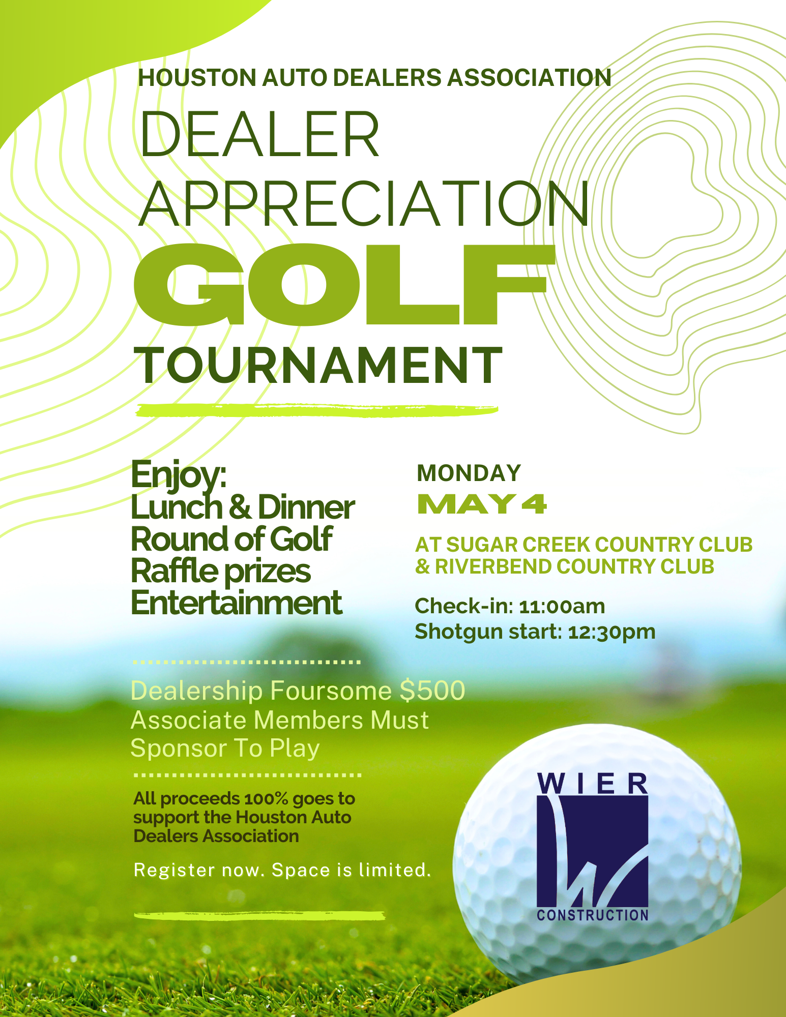 Join us for a day on the greens as the Houston Auto Dealers Association (HADA) hosts our Dealer Appreciation Golf Tournament, presented by Wier Commercial Construction! This exclusive event is our way of thanking our valued dealer members for their hard work and dedication to the industry and our communities.